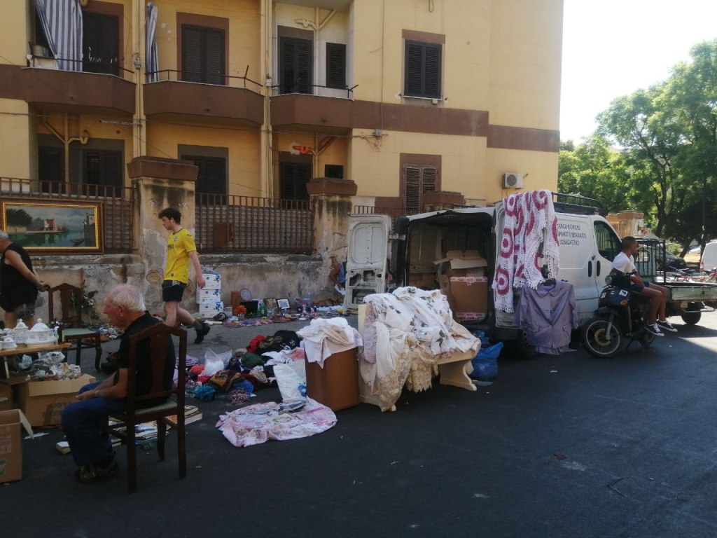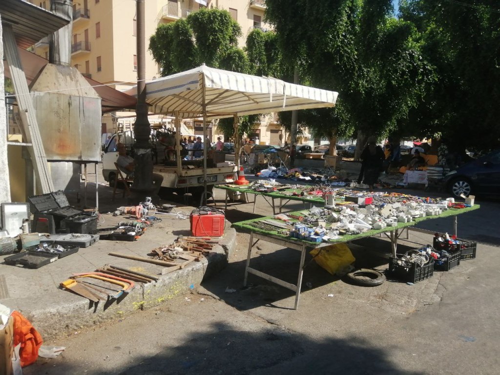 Már végigjártuk a piacot és valami egyéb program után néztünk volna, mikor valami csodálatos dolgot vettünk észre: egy régiség- lom- és mindenespiacot. Dvd-k, kardok, órák, kanapék, biciklik, plüssjátékok, laptopok, fényképezők, ruhák, cipők, tojás, tyúkok, papagájok, és minden egyéb, amit csak el lehet képzelni, kipakolva az út szélére, ponyvákra, asztalokra, vagy csak a betonra. És milyen idilli környezetben! A limlomárusok háta mögött Palermo belvárosának nevezetes épületei törnek az ég felé. Elképesztően hangulatos!