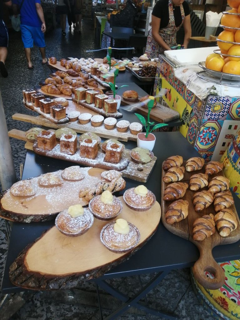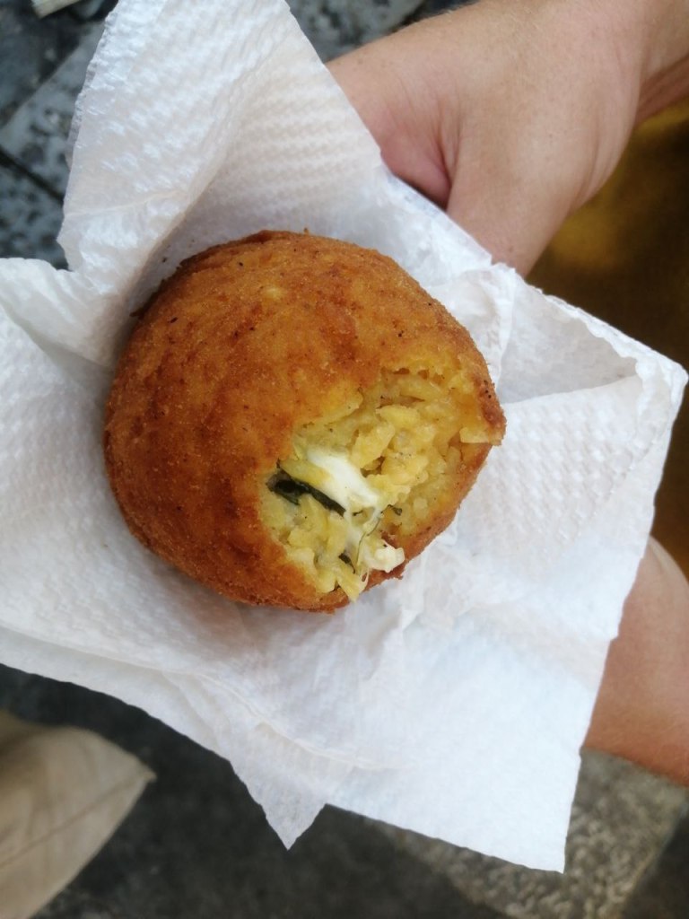 Reggel az első utunk a piacra vezetett, a Mercato di Ballarora. Az interneten jót is, rosszat is bőven olvastam róla, úgyhogy muszáj volt a saját szemünkkel látni. A város reggel 8-9 körül még csak ébredezik, néhány kereszteződésben már ott állnak az árusok gyümölcsöt, zöldséget, friss pékárut kínálva. Ahogy közeledtünk, egyre zegzugosabb utcákon, sikátorokon haladtunk át, ezek váltak aztán a piac utcáivá. Kevesebben voltak, mint amire számítottam, de azért így se nagyon akadt olyan négyzetméter, ahol ne nézelődött volna valaki. Sokfelé jártam már a világban, de itt is akadtak olyan zöldségek és gyümölcsök, amiket még soha nem láttam. Az édességek láttán összefut a nyál az ember szájában, majd két pulttal arrébb már polipok néznek vissza papírtányérból. Vettünk egy spenótos-mozzarellás arrancinat (töltött, olajban kisütött rizsgombócot), itt csak 2 eurót kértek érte, míg a belvárosban 4-5 euró az ára. Nem lesz a kedvencem, de azért jó, hogy megkóstoltuk. Egy kiló szőlőért 1 eurót fizettünk, ezzel meg is volt a reggeli.