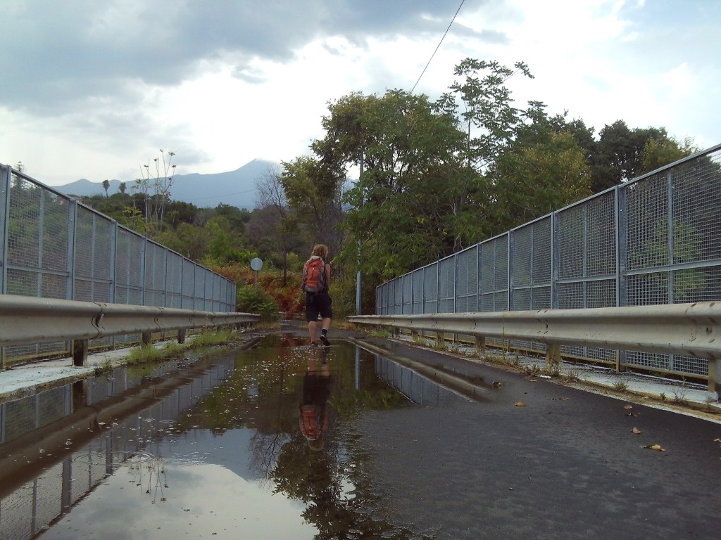 Mivel Botinak fáj a bokája, magamhoz pakoltam a nehéz cuccokat. Úgyis edzeni akartam. Alapvetően egyforma nehézre szoktuk pakolni a táskáinkat, de ha épp nekem nehéz az élet, akkor ő viszi a nehezebbet, ha neki van valami baja, akkor én. Váltakozott az eső és a forró napsütés, hamar elmúlt a lekésett vonat miatti rosszkedvem. Az első város, amin áthaladtunk, Coste volt. Sose hallottunk róla, pedig egész nagy és szép! Fekete macskaköves, kanyargós utcákon vezetett az utunk, még mindig vulkánhamu borította. Ahogy kiértünk a természetbe, élénkzöld, pálmákkal tarkított dombos vidék fogadott, a látóhatáron hatalmas, kék hegyek törtek az ég felé. Botit a trópusokra emlékeztette, engem az Azori-szigetekre.