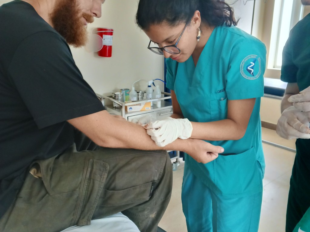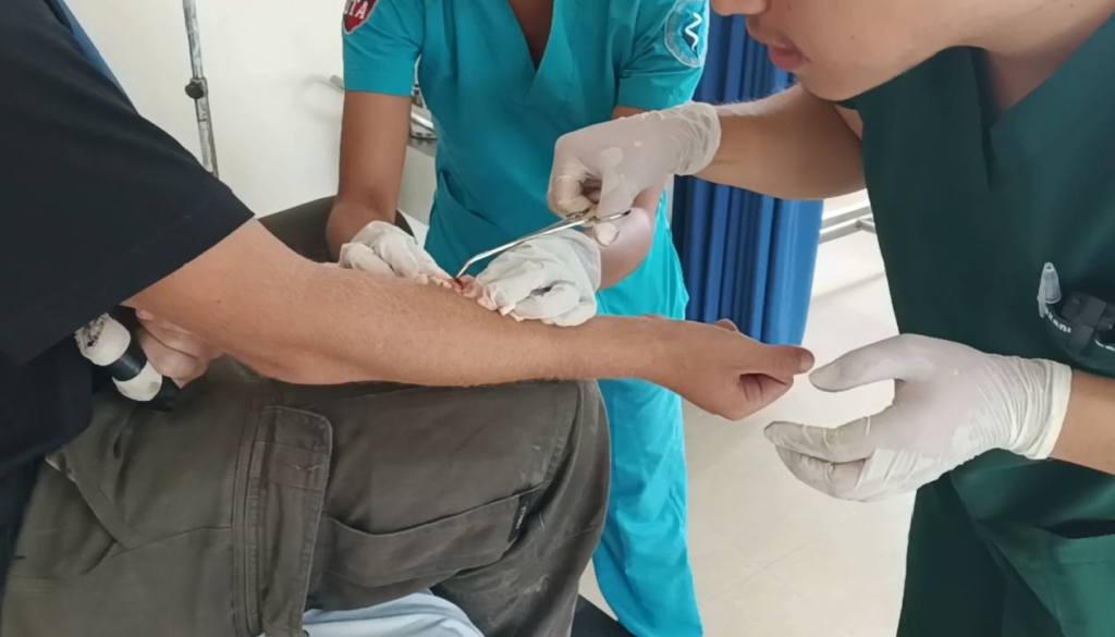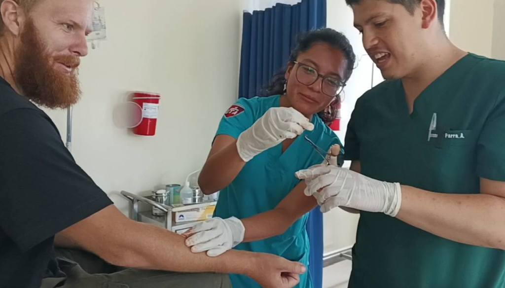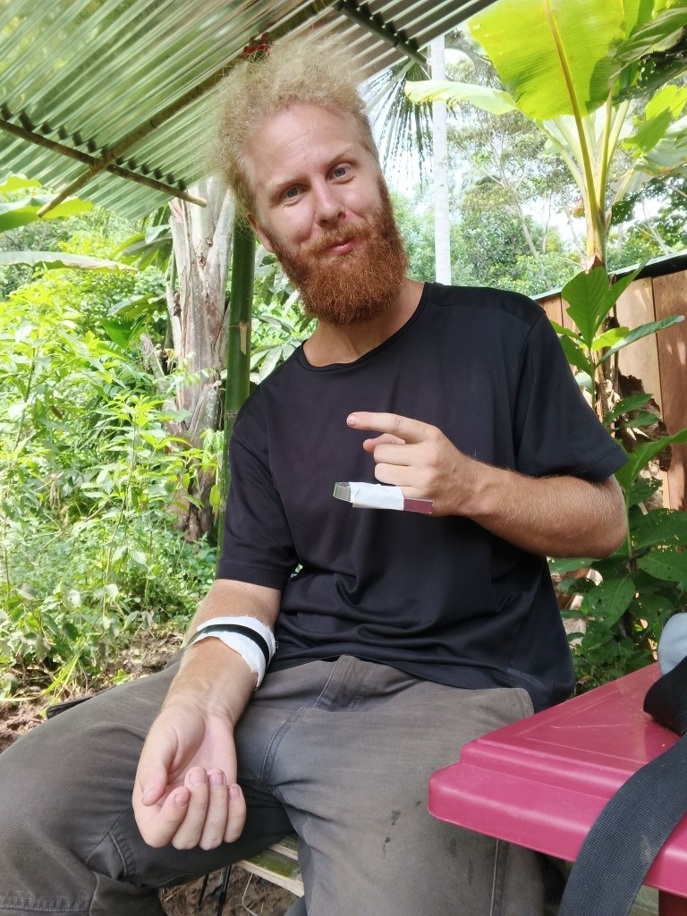 Kis idő múlva már egy asztalon találtam magam, kedves orvosok között, akiknél kések voltak. Viccesen mondtam neki, hogy Kelet-Európában nincsen érzéstelenítés, így elkezdte anélkül, majd mondta: „You are strong.” Majd azért kaptam 6 lidokaininjekciót, és elkezdődött a vadászat. Egyébként mondták, hogy ilyen itt nincs, és a több tízezer betegből senkinek nem volt még, mert ez innen nagyon messze, belső Amazóniában van csak, és csak könyvben láttak ilyet, legendákat erről. Nem biztos, hogy hittek nekem, hogy ez lesz, de szépen szétvágták a karom, és nagyon kedvesen, profin viselkedtek, mondták, hogy nyugodtan mondjam, ha fáj, miután már az inakon pengették a késeket, mivel az állat menekülőre fogta. Egyre beljebb ette magát, itt már azért azt hittem, meghalok. ![]()