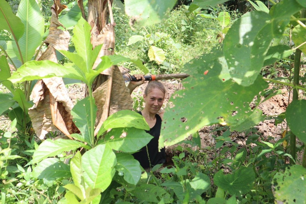 Megy a meló! Mivel a kis párszáz fős falunál messzebbre most nem tudunk eljutni a tüntetésekkel kapcsolatos lezárások miatt, így azzal kell dolgoznunk, ami van. Szerencsére találtunk egy kis barkácsboltot, ahol 1,5 dolláros kakaópalánták mellett még sok hasznos dolgot is lehet kapni, például ecsetet és fa lazúr festéket.
